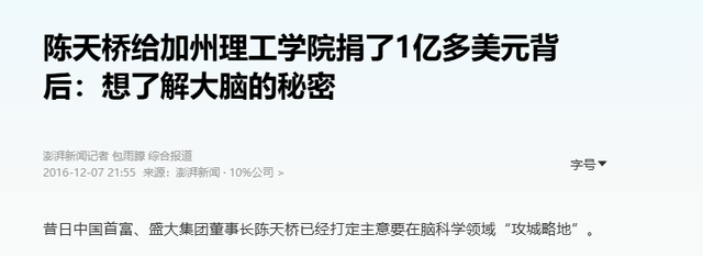 澎湃新闻————陈天桥给加州理工学院捐了1亿多美元背后:想了解大脑的秘密